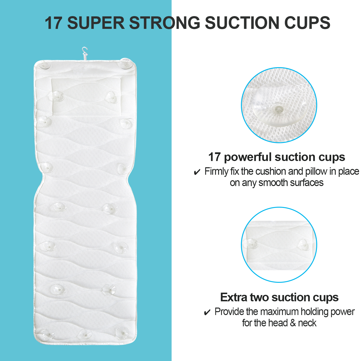 ♥17 ANTI-SLIP SUCTIONS CUPS: Equipped with 17 powerful suction cups on the underside, which can firmly fix the cushion and pillow in place on any smooth surfaces(Not for textured surfaces). More secure than other spa pillows with 10 or 13 suction cups on the market. No more slipping & sliding