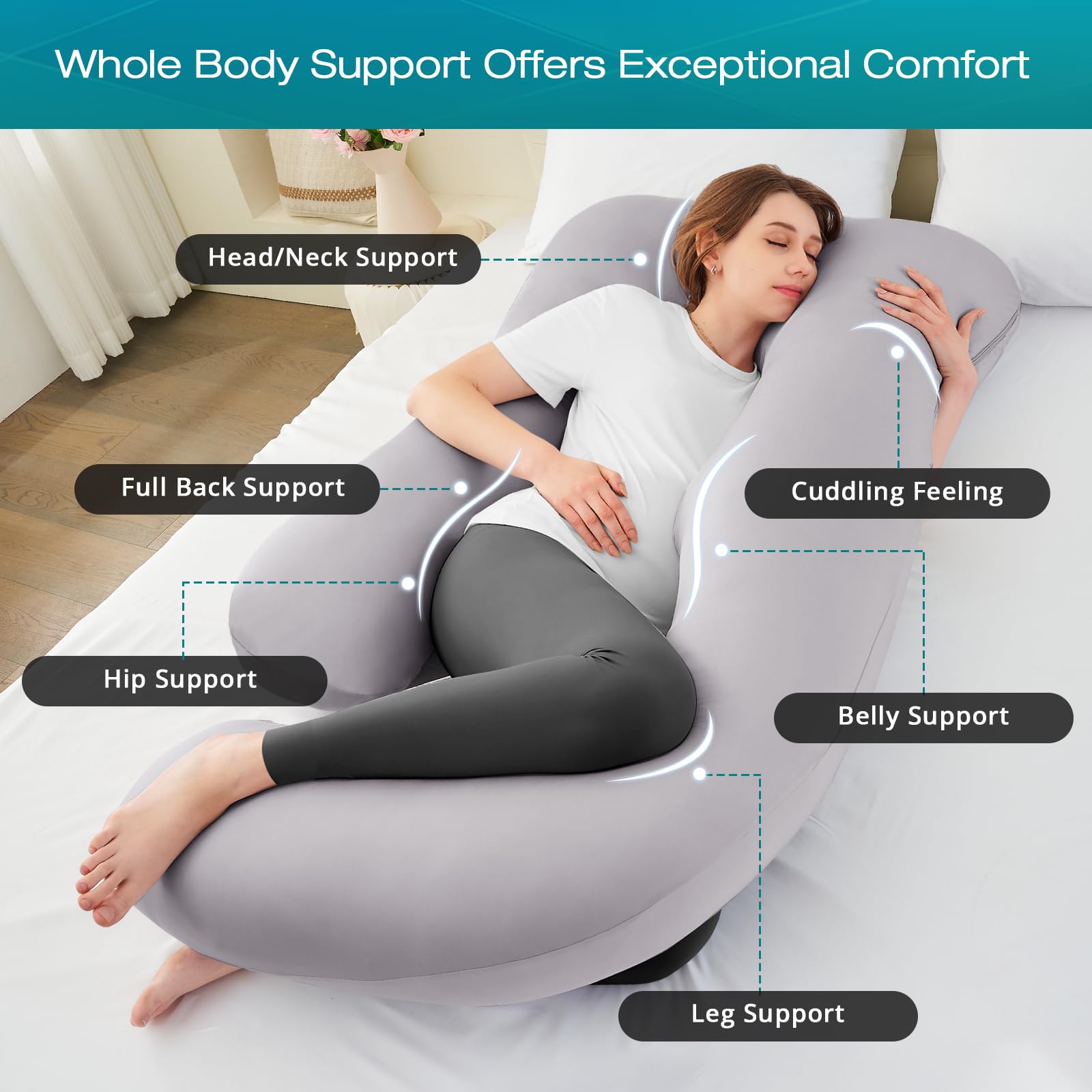 Premium Down Alternative Filling: Our U-shaped full body pillow is filled with 7lbs down-alternative filling. Blended with 40% silicified fiber and 60% polyester fibers, our pregnancy pillow strikes a good balance between support and comfort