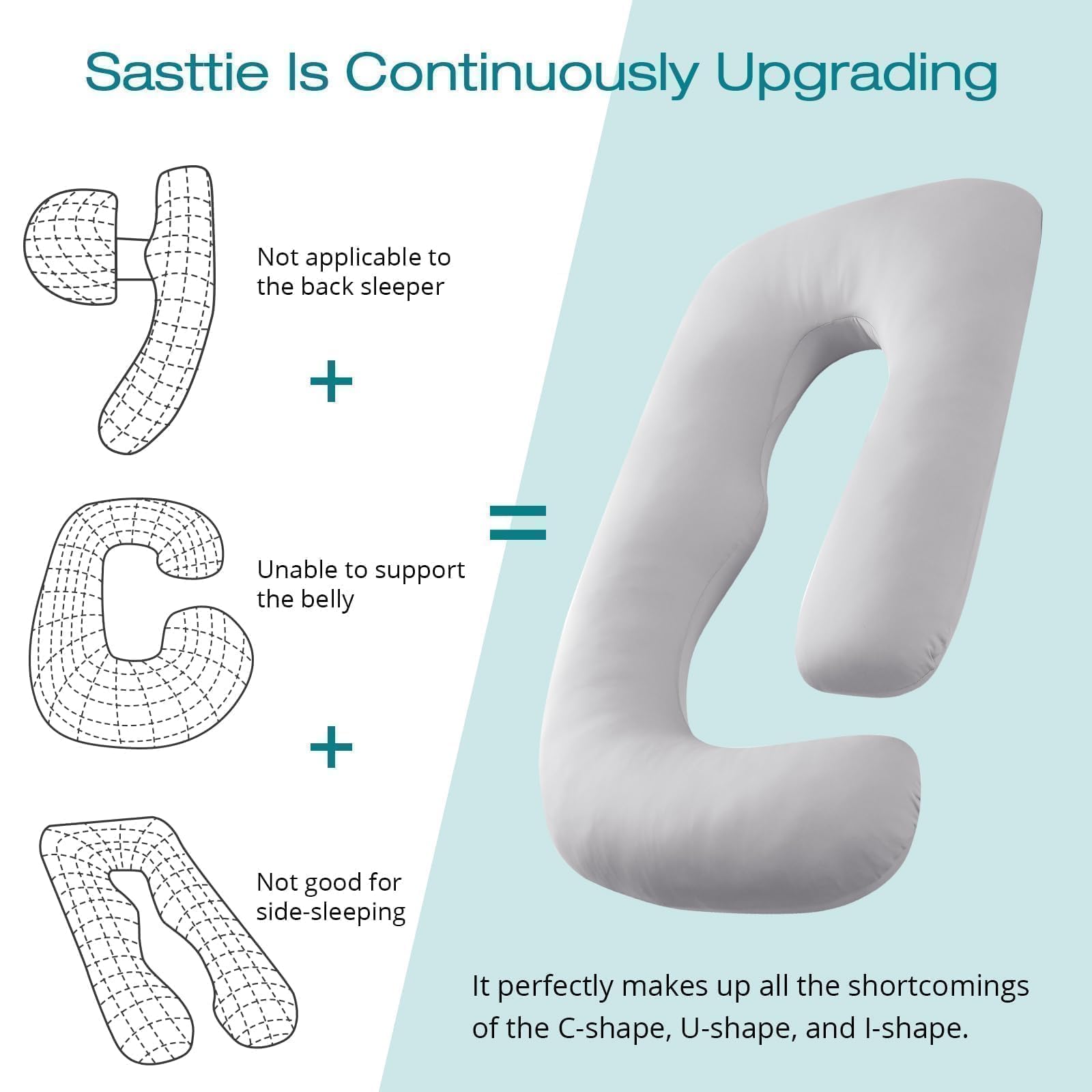 Upgraded U Shaped Pregnancy Pillows: Features an ergonomically designed shape, SASTTIE 4.0 U-shaped pregnancy pillow could fit your body well and provide firm support for your sore shoulders, numb arms, growing belly, tight back, as well as swollen feet